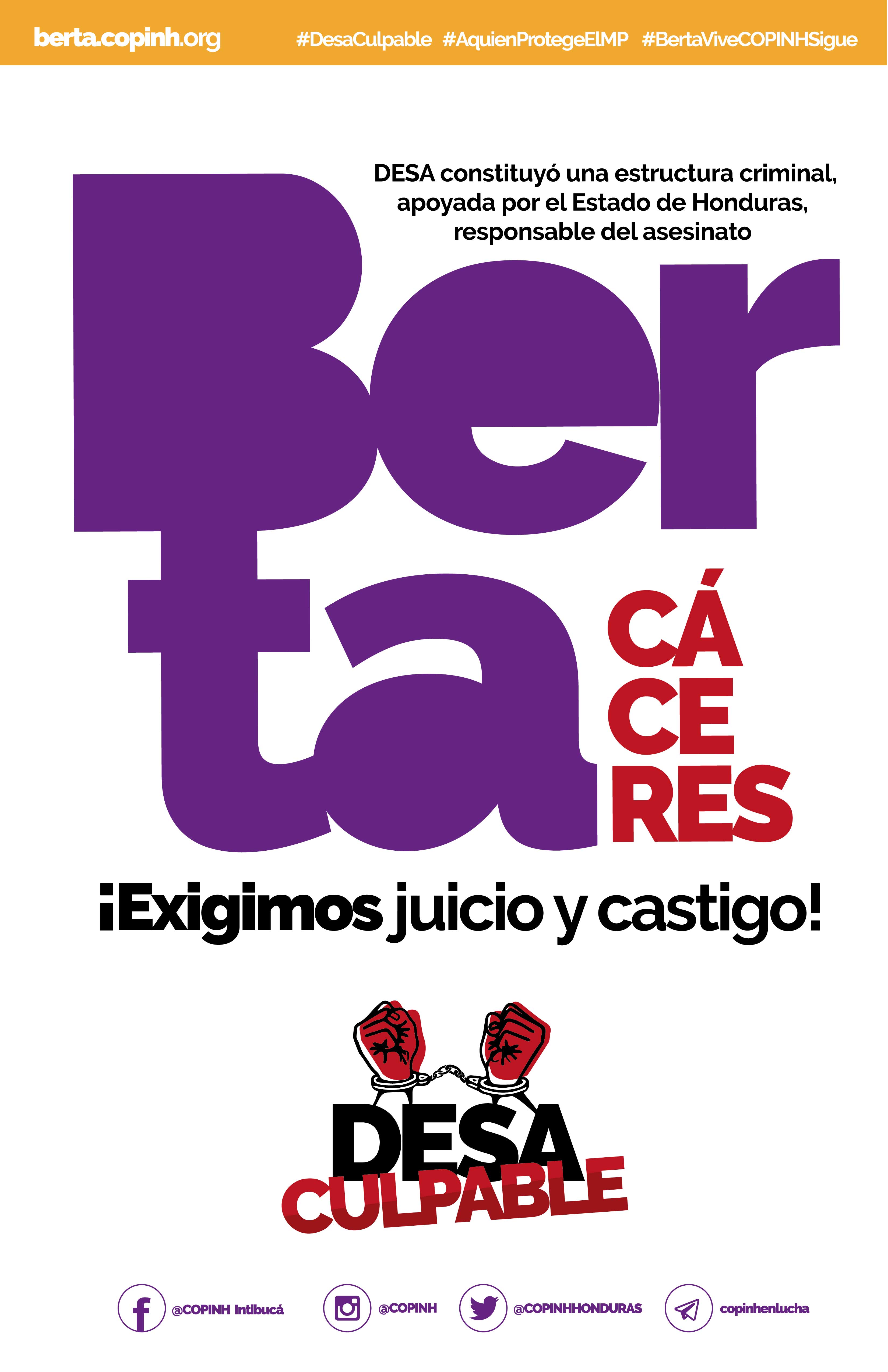 Il 4 settembre scorso si è conclusa l’udienza di comparizione delle parti e trattazione della causa. Secondo il Copinh, la decisione della Corte di non ammettere alcune prove, tra cui la comparizione come testimoni di membri della famiglia Atala Zablah, dirigenti di Desarrollos Energético SA (Desa), ostacolerebbe la ricerca di un legame tra l’omicidio, gli esecutori materiali e dirigenti della compagnia come autori intellettuali del crimine. A pochi giorni dall’inizio del processo, il Copinh ha lanciato la campagna #DesaCulpable e ha presentato il sito web Berta Cáceres, che permetterà l’accesso a tutte le informazioni, notizie e analisi sul processo.