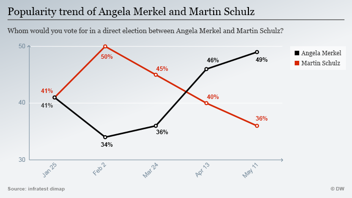 I sondaggi più recenti danno oggi la SPD con un distacco di circa dieci punti percentuali dalla CDU in vista delle elezioni federali, con il divario che si è sensibilmente allargato rispetto ad appena un mese fa. Anche un’ipotetica sfida a due tra Schulz e Merkel vedrebbe il leader Social Democratico soccombere, come conferma una rilevazione della rete ARD che dà la cancelliera al 49% contro il 36% del rivale.