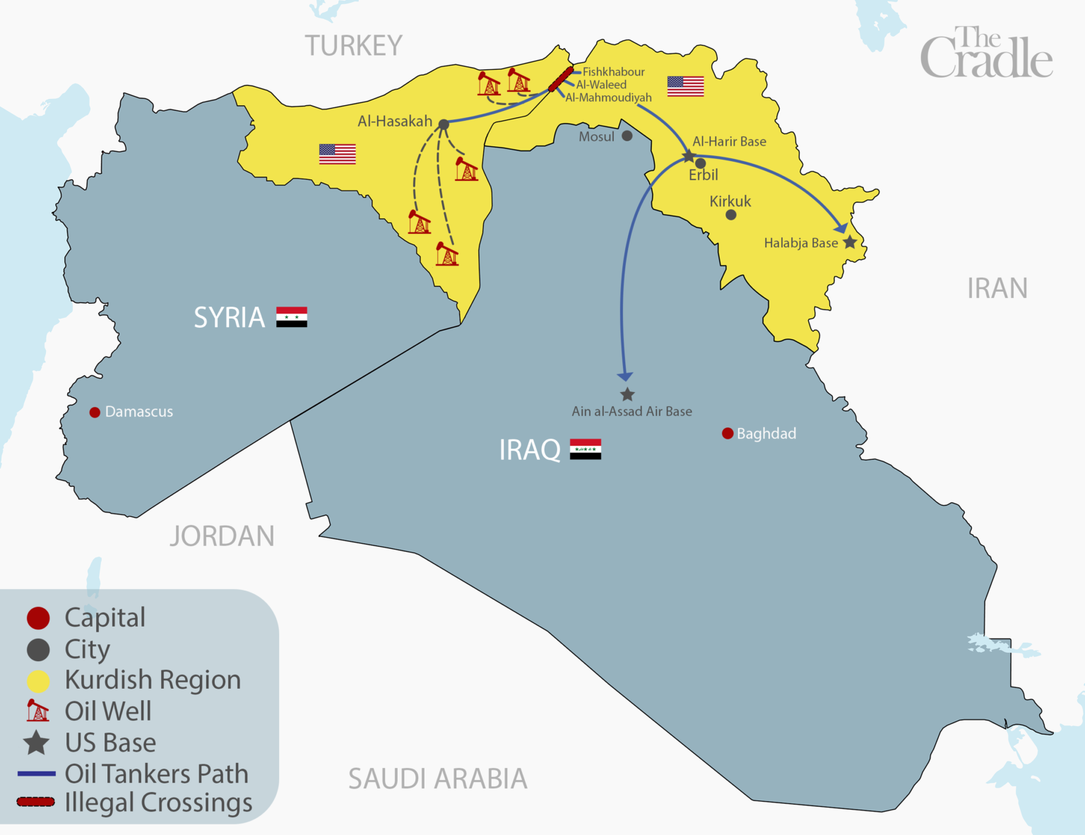 Testimoni iracheni dell’attività di contrabbando curdo-americana affermano che ogni singolo convoglio conta dalle 70 alle 100 autocisterne cariche di petrolio siriano. L’itinerario percorso sotto la protezione USA inizia dalla regione di al-Jazira, per poi fare sosta presso la base americana di al-Hasakah e ripartire verso l’Iraq. Attraversato il confine, fuori dal controllo del governo centrale, il petrolio saccheggiato viene trasferito ad altre autocisterne nella già ricordata base curda di al-Harir. Da qui arriva infine alternativamente alla base militare americana di Ain al-Assad, nella provincia irachena di Anbar, o in quella situata nella provincia di Halabja.