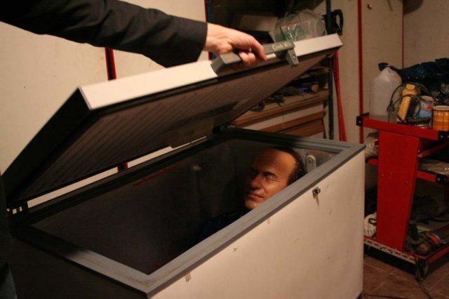 Il corpo di Berlusconi chiuso in un congelatore. Sul volto il sorriso di sempre, congelato pure quello. E la cosa più strana è che chi lo tiene in fresco, il suo “assassino” non è un acerrimo oppositore politico, è uno che l’ha addirittura votato. Con quel fatalismo rassegnato che è tipico degli italiani di oggi.