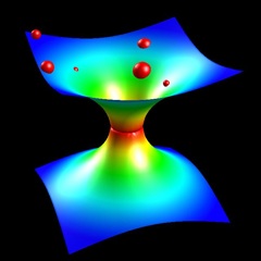 La geometria dell’ologramma, dove vive il gravitone, è nota come spaziotempo di Anti-de Sitter. Questo spaziotempo è caratterizzato dall’avere una costante cosmologica negativa (di segno opposto a quella, positiva, misurata nel nostro universo) e una geometria molto particolare: lo spazio è racchiuso dentro un bordo, un po’ come un’arancia è racchiusa dalla sua buccia. Una particella che si muova nella direzione radiale, dopo una certa distanza incontra la fine dello spazio, una specie di muro invalicabile, che altro non è se non la superficie bidimensionale dove vivono le nostre biglie di partenza.