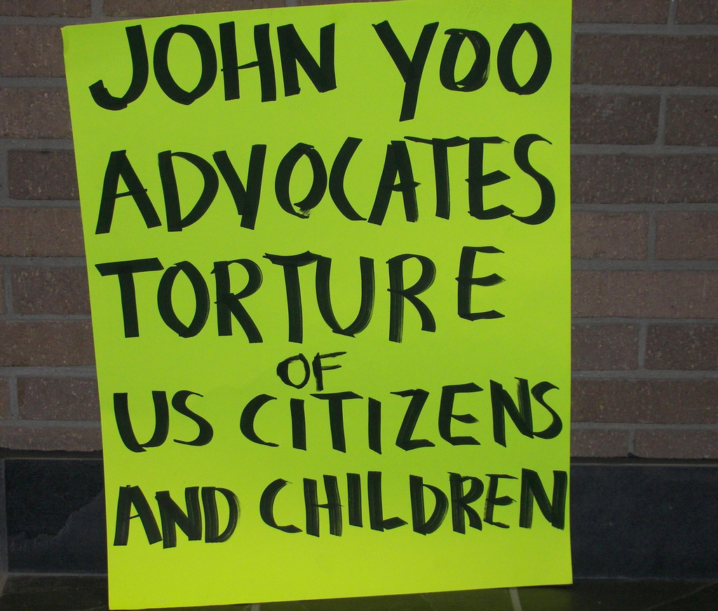 Dalla penna e dal pensiero di John Yoo sono uscite alcune delle trovate più apprezzate dall’amministrazione Bush, ma il vero capolavoro restano i memorandum che legittimano l’uso della tortura da parte degli agenti della CIA. Qualche mese fa lo stesso autore ha confidato alla rivista Esquire di averli preparati in fretta e furia in vista dell’arresto di alcuni degli attentatori dell’11 settembre, ma sempre stando bene attento a non cadere in pericolose vaghezze. D’altra parte, la tortura è una specie di dogma religioso per John Yoo. L’annegamento simulato, ad esempio, forma estrema di punizione corporale nata ai tempi dell’Inquisizione e duramente criticata dagli americani quando a praticarla erano i giapponesi, nella prosa di Yoo si è ingentilito, divenendo una “tecnica potenziata di interrogatorio”.