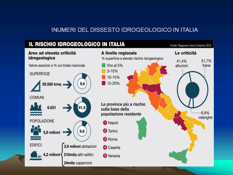 Siamoin un Paese dove alle pendici dei vulcani si sono costruiti paesi interi in barba ad ogni minimo buonsenso prima che ad ogni legge; non è un mistero che una eventuale eruzione del Vesuvio veda la possibilità di azzerare decine di paesi e si calcola in un milione il numero dei morti potenziali se l’eruzione avvenisse in forma improvvisa e di notte. E siamo un paese dove il 70% degli ospedali e soprattutto le scuole sono a rischio crollo parziale o totale per assenza di manutenzione ordinaria e straordinaria.