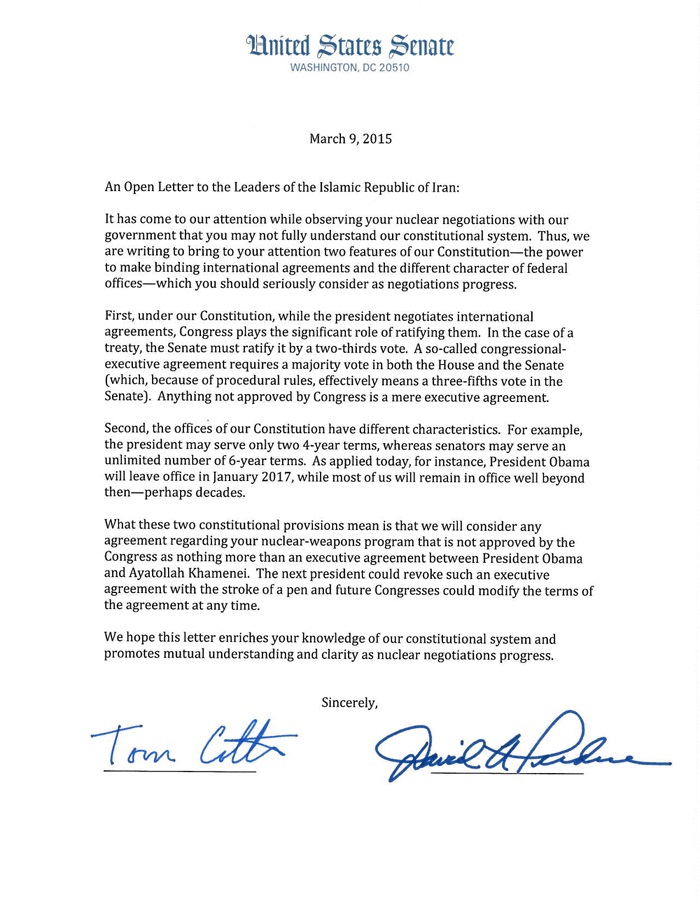 47 senatori della maggioranza repubblicana hanno cioè indirizzato una lettera aperta alle autorità della Repubblica Islamica per avvertire che qualsiasi eventuale accordo dovesse uscire dai colloqui tra Teheran e i P5+1 (USA, Russia, Cina, Francia, Gran Bretagna, Germania) potrebbe avere validità soltanto finché il presidente Obama risiederà alla Casa Bianca.