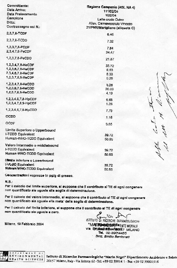 Risultati delle analisi effettuate dall’istituto Mario Negri sui terreni della famiglia Cannavacciuolo |