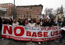 Allo stesso modo è stata falsificata l’immagine dei vicentini; prima di tutto descrivendo la protesta come minoritaria, poi cercando di connotarla con definizioni prese senza molta intelligenza dall’armamentario della propaganda meno qualificata. Ignorare o negare completamente la presenza di migliaia di persone clamorosamente non ascrivibili alle simpatiche categorie di “pacifinto, rosso o terrorista”, non è servito a molto, se non a dimostrare anche a queste persone che si fa uso della menzogna sistematica. Vittime di questo squadrismo giornalistico sono rimasti addirittura quelli di Azione Giovani (AN). Hanno scelto di protestare a Caldogno, in disparte, per distinguersi. Dai giornali però non è possibile capire se abbiano manifestato pro o contro la base, ci sono cronache contrastanti, qualcuno non la racconta giusta. Anche Alessandra Mussolini ha sfilato altrove (inibita dalla questura) e si è detta indignata che non le fosse permesso quello che si consentiva alle “orde” in arrivo.
