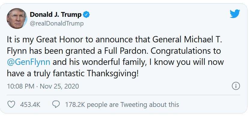 Dopo che il giudice federale assegnato al caso, Emmet Sullivan, aveva respinto la versione di Flynn, quest’ultimo era tornato sui propri passi, dichiarandosi nuovamente colpevole. Dall’agosto 2019 si sarebbero susseguiti altri tentativi di ottenere un proscioglimento, fino a che Flynn aveva ritirato per la seconda volta la sua dichiarazione di colpevolezza. Con la sentenza nei suoi confronti rimandata in più occasioni, a inizio 2020 la vicenda ha preso una piega eccezionale. Il ministro della Giustizia, William Barr, aveva annunciato una revisione del caso e nel mese di maggio il suo dipartimento ha presentato un’istanza per far cadere tutte le accuse nei confronti di Flynn. Il giudice Sullivan avrebbe però respinto la clamorosa richiesta, ma il procedimento è rimasto da allora ingolfato. La decisione di Trump di concedere la grazia ha alla fine concluso bruscamente l’intera vicenda legale.