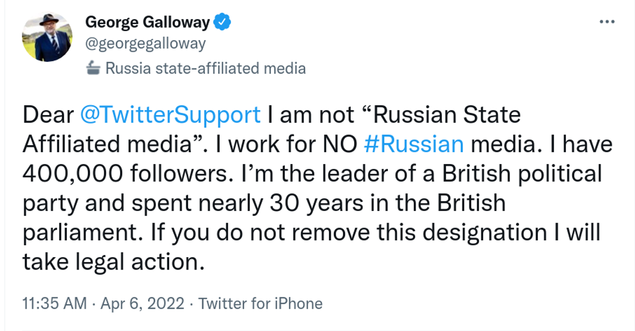 Dal 6 di aprile, l’account Twitter di Galloway è accompagnato dalla dicitura “media affiliato allo stato russo”, che appare puntualmente anche assieme a tutti i suoi tweet. Oltre ad avere apposto questo marchio, come si legge nelle spiegazioni della misura adottata, Twitter “non raccomanda [agli utenti] né amplifica account o tweet” in questa categoria. Questa pratica è in vigore sul popolare “social” già dal 2020, ma è stata prevedibilmente intensificata dopo l’inizio del conflitto in Ucraina.